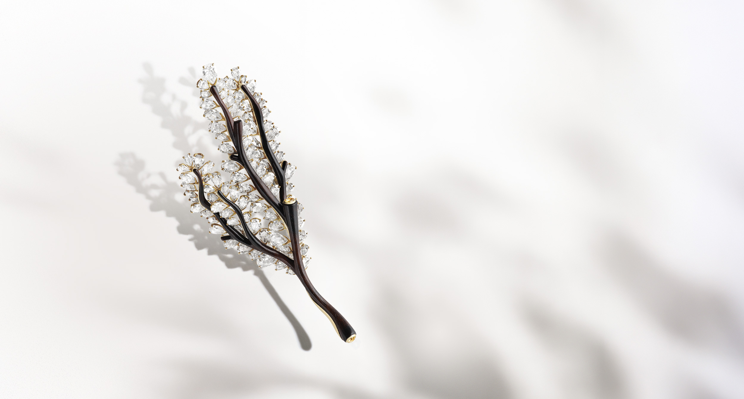 在《時光築藝》中,Cindy Chao 以羽毛、楓葉與樹枝等經典主題,展現其二十年精湛淬鍊的工藝,探尋自然的多重面貌。她以靜馭動,在靜止的珠寶中呈現自然的有機生命力;她收放自如,毫不費力地雕塑出生命的律動與張力。